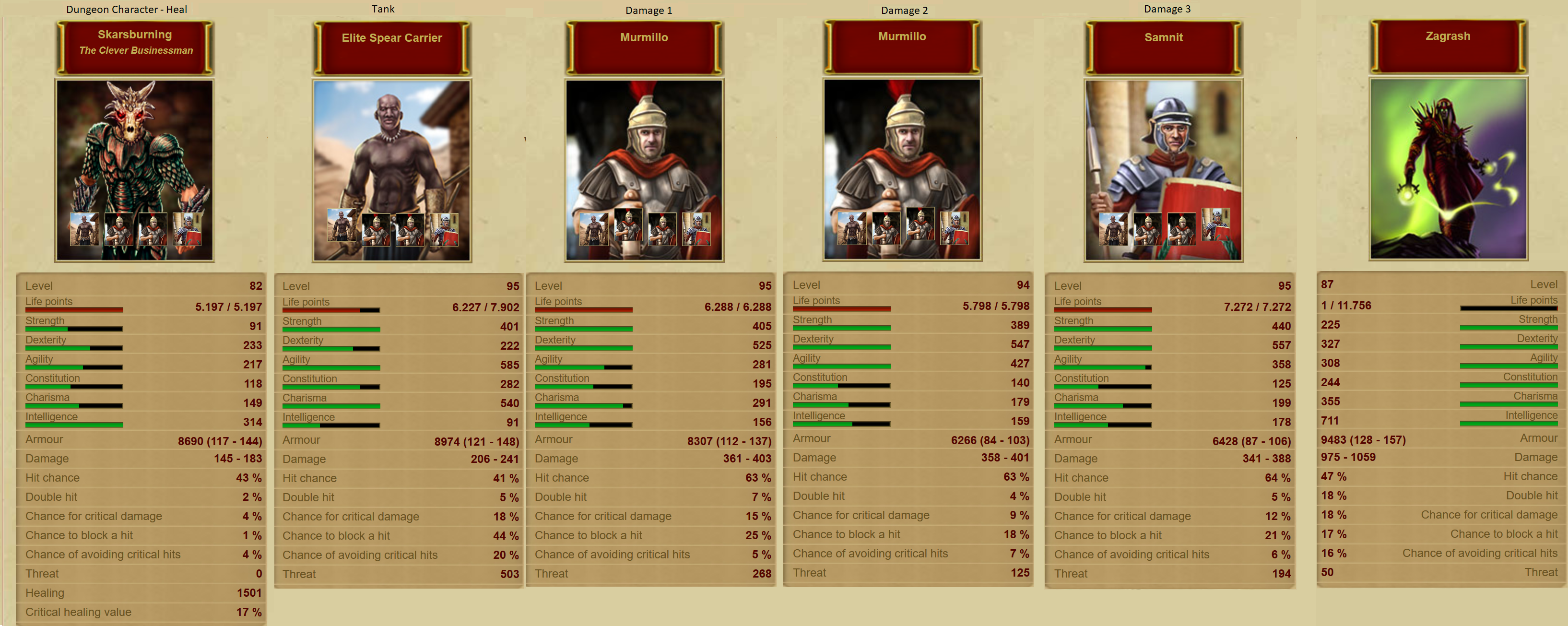 - Absolute current level Mercenaries (92+ level). Healing from Dungeon character, Grandmaster/Elite Spear for tanking and Samnits and Murmillos for Damage. Murmillos are a bit better here because they have more health and can withstand the devastating mass damage attacks of Zagrash